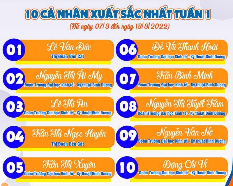Chiều ngày 14/3, Ban Thường vụ Tỉnh Đoàn Bình Dương đã công bố kết quả tuần 1 và danh sách 10 thí sinh có thành tích xuất sắc nhất Tuần 1 Cuộc thi tìm hiểu Lịch sử Đảng bộ tỉnh, Lịch sử Đoàn tỉnh Bình Dương và 04 bài lý luận chính trị.