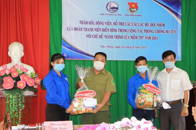 Được biết, trong đợt thăm hỏi này, Ban chỉ đạo 138 tỉnh đã trao tặng 03 phần quà cho các tập thể và 15 phần quà cho các cá nhân hoạt động hiệu quả trong công tác phòng chống ma túy với tổng trị giá 22,5 triệu đồng và Ban Thường vụ Tỉnh Đoàn hỗ trợ các phần quà tổng trị giá 10 triệu đồng tại các đơn vị Thành phố Thuận An, Thị xã Tân Uyên và Huyện Dầu Tiếng. Đây là nguồn động viên để các CLB “Thắp sáng niềm tin” và các cá nhân tích cực hơn nữa trong công tác phòng, chống các tệ nạn ma túy trên địa bàn tỉnh.