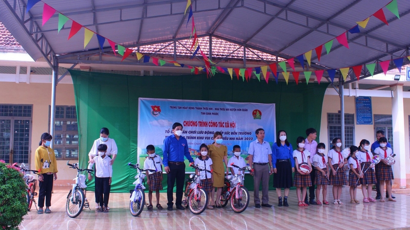 Dịp này, Trung tâm Hoạt động thanh thiếu nhi tỉnh còn trao tặng 5 chiếc xe đạp, tổng trị giá gần 10 triệu đồng đến 5 em học sinh khó khăn của Trường Tiểu học Trà Thanh. Đây là món quà ý nghĩa với các em học sinh khó khăn về phương tiện đến trường, giúp con đường đến trường của các em dễ dàng hơn.