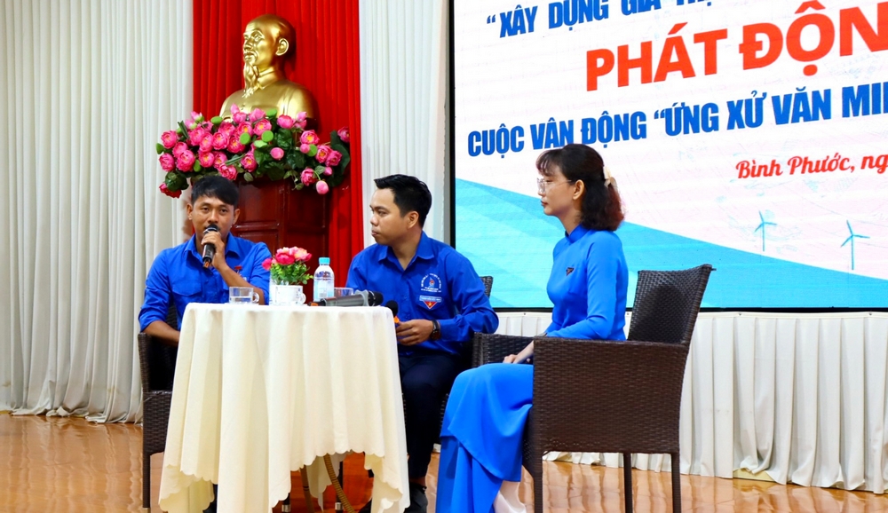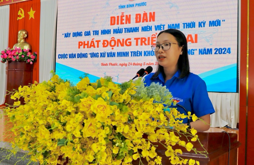Phó Bí thư Tỉnh Đoàn Bình Phước Lê Thị Hồng Phấn phát biểu triển khai cuộc vận động “Xây dựng giá trị hình mẫu thanh niên Việt Nam thời kỳ mới”; phát động triển khai Cuộc vận động “Ứng xử văn minh trên không gian mạng” năm 2024