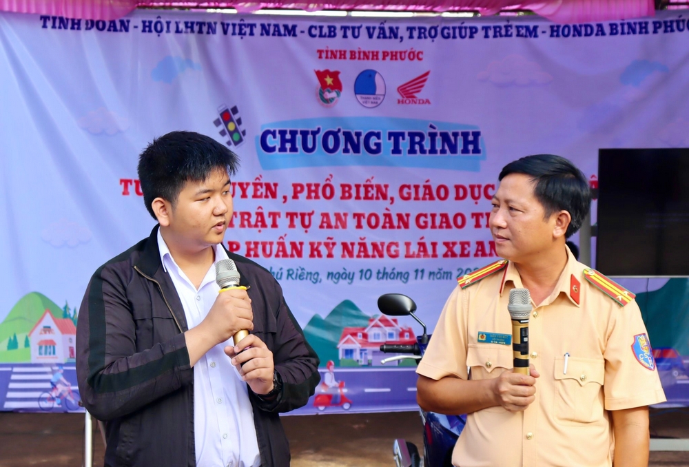 Tại chương trình, đồng chí Trần Văn Mức - Đội trưởng Đội CSGT (Công an huyện Phú Riềng) đã tuyên truyền pháp luật giao thông đường bộ, hướng dẫn kinh nghiệm, kiến thức điều khiển phương tiện giao thông đúng pháp luật, bảo đảm an toàn cho bản thân và người khác khi tham gia giao thông.