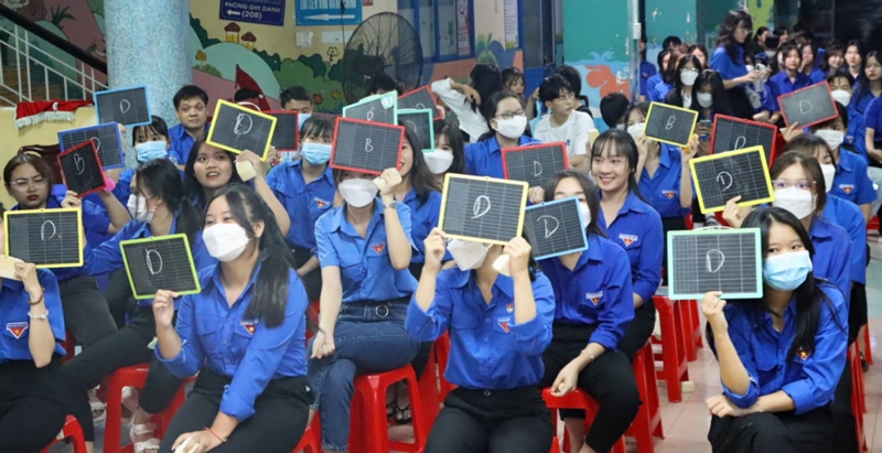 Các em học sinh tham gia phần thi Rung chuông vàng tìm hiểu về cuộc đời, sự nghiệp của Chủ tịch Hồ Chí Minh