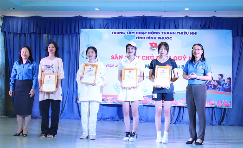 Chị Lê Thị Hồng Phấn - Phó Bí thư Tỉnh Đoàn, Chủ tịch Hội đồng Đội tỉnh (bên phải ngoài cùng) và chị Mai Tuyết Ngọc - Giám đốc Trung tâm hoạt động TTN tỉnh (bên trái ngoài cùng) trao giấy chứng nhận nhất, nhì, ba, khuyến khích cho 4 trường tham gia phần thi Thời trang handmade