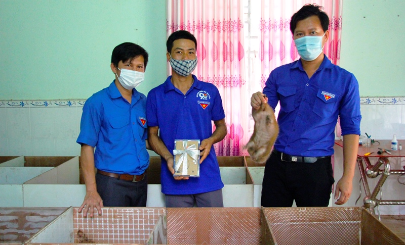 Phó Bí thư Tỉnh Đoàn Trần Hoàng Trực thăm mô hình nuôi dúi, tặng sách dạy về kỹ năng khởi nghiệp cho thanh niên tín đồ tôn giáo Phạm Văn Võ (chính giữa) ngụ tại thôn 10, xã Đăk Ơ