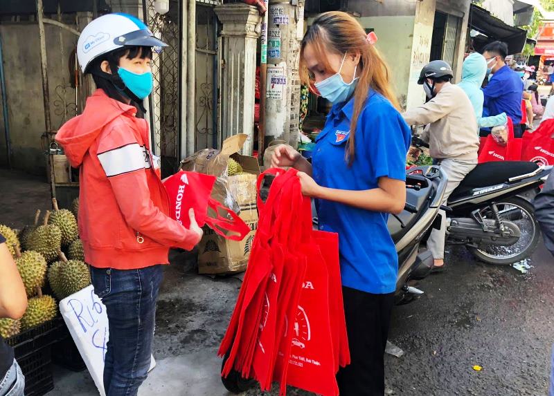 Đoàn viên thanh niên phường Phú Thủy, thành phố Phan Thiết phát túi vải cho người dân