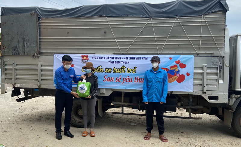 Đặc biệt, ngày 11/7/2021, Ban Thường vụ Tỉnh đoàn Bình Thuận tổ chức xuất quân chương trình “Chuyến xe tuổi trẻ - San sẻ yêu thương”. Tại chương trình, Ban Thường vụ Tỉnh Đoàn đã triển khai 18 chuyến xe, chở các dụng cụ y tế phòng chống dịch, các nhu yếu phẩm (quần áo bảo hộ y tế, nước sát khuẩn, khẩu trang y tế, kính chắn giọt bắn, nước lọc, nước tăng lực, gạo, mắm, muối, bột nêm, dầu ăn, trứng, thịt hộp, khoai lang, thanh long…) để thăm, tặng các lực lượng tuyến đầu chống dịch, thanh thiếu nhi và người dân đang cách ly tại các khu cách ly tập trung, thanh thiếu nhi và người dân có hoàn cảnh khó khăn chịu ảnh hưởng, tác động trực tiếp bởi dịch bệnh Covid-19 tại tất cả các huyện, thị xã, thành phố và các đơn vị lực lượng vũ trang. Tổng giá trị các phần quà trong chương trình xuất quân chuyến xe tuổi trẻ lần này là trên 1,2 tỷ đồng và Chương trình “Triệu bữa cơm” đã hỗ trợ trao tặng 250 suất quà bao gồm các nhu yếu phẩm (gạo, trứng, thịt hộp, khoai lang, nước mắm…) cho bà con nhân dân ở các khu vực bị phong tỏa và khu cách ly tại xã Phú Lạc, huyện Tuy Phong; Khu cách ly Aloha Thuận Quý, huyện Hàm Thuận Nam; Chốt kiểm dịch tại Thuận Hòa, huyện Hàm Thuận Bắc; thanh thiếu nhi và người dân có hoàn cảnh khó khăn trên địa bàn thành phố Phan Thiết.