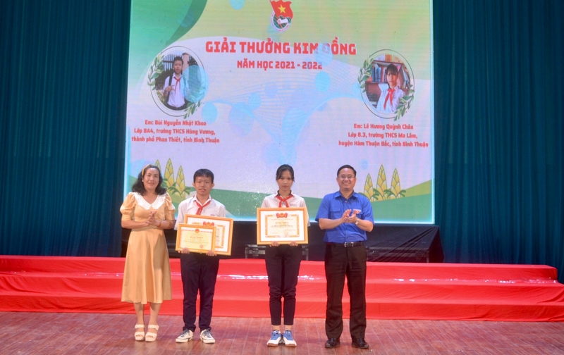 Nhân dịp này, thừa ủy quyền Ban Bí thư Trung ương Đoàn, đồng chí Nguyễn Quốc Huy - Bí thư Tỉnh đoàn đã trao Giải thưởng Kim Đồng cho em Bùi Nguyễn Nhật Khoa, lớp 8A4, trường THCS Hùng Vương, TP Phan Thiết và em Lê Hương Quỳnh Châu, lớp 83, trường THCS Ma Lâm, huyện Hàm Thuận Bắc. Đây là giải thưởng cao quý của Trung ương Đoàn Thanh niên Hồ Chí Minh trao tặng cho cán bộ chỉ huy Đội và đội viên xuất sắc trên toàn quốc. Ngoài ra, em Bùi Nguyễn Nhật Khoa là 1 trong 20 gương đội viên xuất sắc toàn quốc được Bộ trưởng Bộ Giáo dục và Đào tạo tặng Bằng khen đội viên có thành tích xuất sắc trong công tác Đội và phong trào thiếu nhi toàn quốc./.