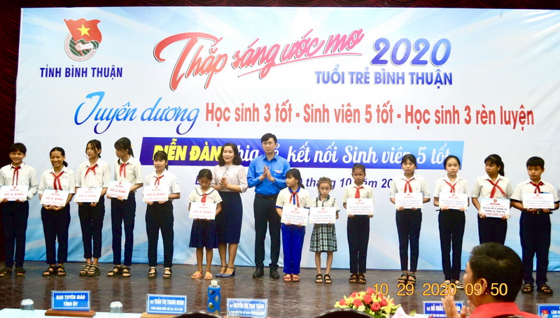 Ngoài việc tuyên dương các gương học sinh, sinh viên điển hình, Tỉnh đoàn còn tổ chức chương trình “Thắp sáng ước mơ tuổi trẻ Bình Thuận”. Qua đó, phối hợp Hội khuyến học tỉnh trao 30 suất học bổng Thắp sáng ước mơ cho các em học sinh, sinh viên có hoàn cảnh khó khăn nhưng vượt khó, học giỏi. Đồng thời, phối hợp với Sở Giáo dục và Đào tạo trao tặng 45 suất học bổng Vừ A Dính và Câu lạc bộ Vì Hoàng Sa – Trường Sa thân yêu cho các em học sinh, sinh viên là đồng bào dân tộc thiểu số, con ngư dân Bình Thuận có hoàn cảnh khó khăn, tiếp tục đến trường (mỗi suất học bổng trị giá 1 triệu đồng).