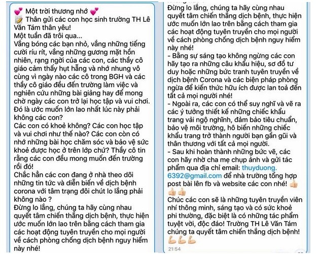 Chúc các con sẽ là những tuyên truyền viên nhí thông minh, sáng tạo và có sức khoẻ phi thường, đặc biệt là có những tác phẩm tuyệt vời, độc đáo! Trường TH Lê Văn Tám chúng ta quyết tâm chiến thắng dịch bệnh!"