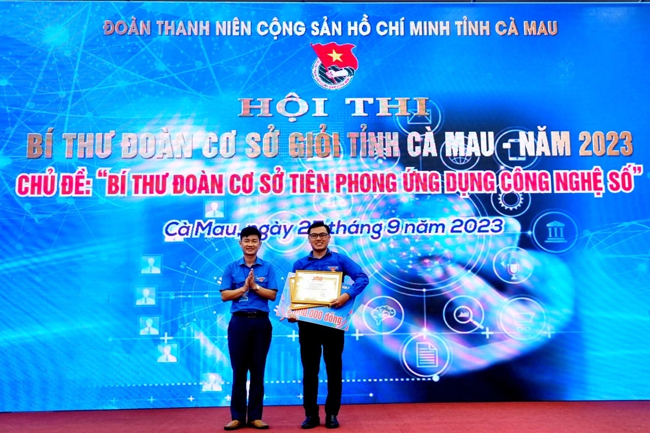 Đồng chí Nguyễn Hoàng Đạo, Bí thư Tỉnh đoàn trao giải Nhất cho đồng chí Nguyễn Văn Khỏe, Bí thư Đoàn cơ sở phường 2, thành phố Cà Mau; đồng chí Trần Đăng Khoa, Phó Bí thư Tỉnh đoàn trao giải Nhì cho đồng chí Trịnh Hoài Mộng, Bí thư đoàn xã Lợi An