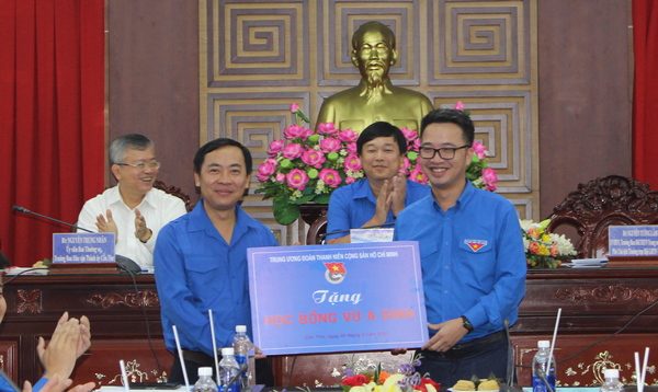 Đồng chí Nguyễn Tường Lâm - Ủy viên BTV, Trưởng Ban Đoàn kết tập hợp Thanh niên Trung ương Đoàn, Phó Chủ tịch thường trực Hội LHTN Việt Nam trao bảng tượng trưng học bổng Vừ A Dính cho đồng chí Đào Chí Nghĩa - Ủy viên BTV Trung ương Đoàn, Bí thư Thành đoàn Cần Thơ