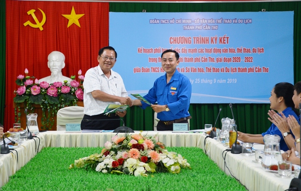 Đồng chí Trần Việt Phường - Giám đốc Sở Văn hóa Thể thao và Du lịch thành phố và đồng chí Đào Chí Nghĩa - Bí thư Thành đoàn Cần Thơ ký kết kế hoạch liên tịch