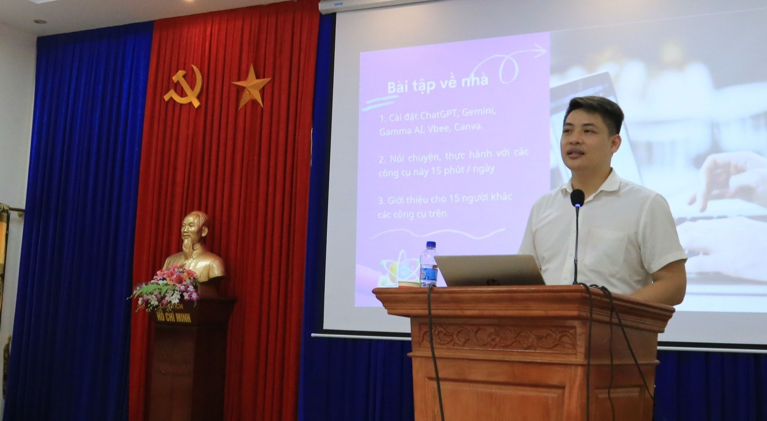 Trong chương trình, các đoàn viên, thanh niên được giới thiệu và hướng dẫn sử dụng nhiều công cụ AI phổ biến như ChatGPT, CapCut, các ứng dụng chuyển giọng nói thành văn bản, hỗ trợ thiết kế logo, tạo hình ảnh và video.