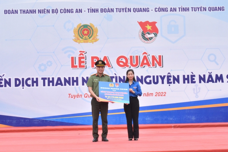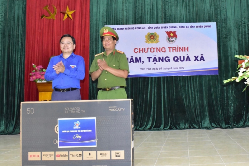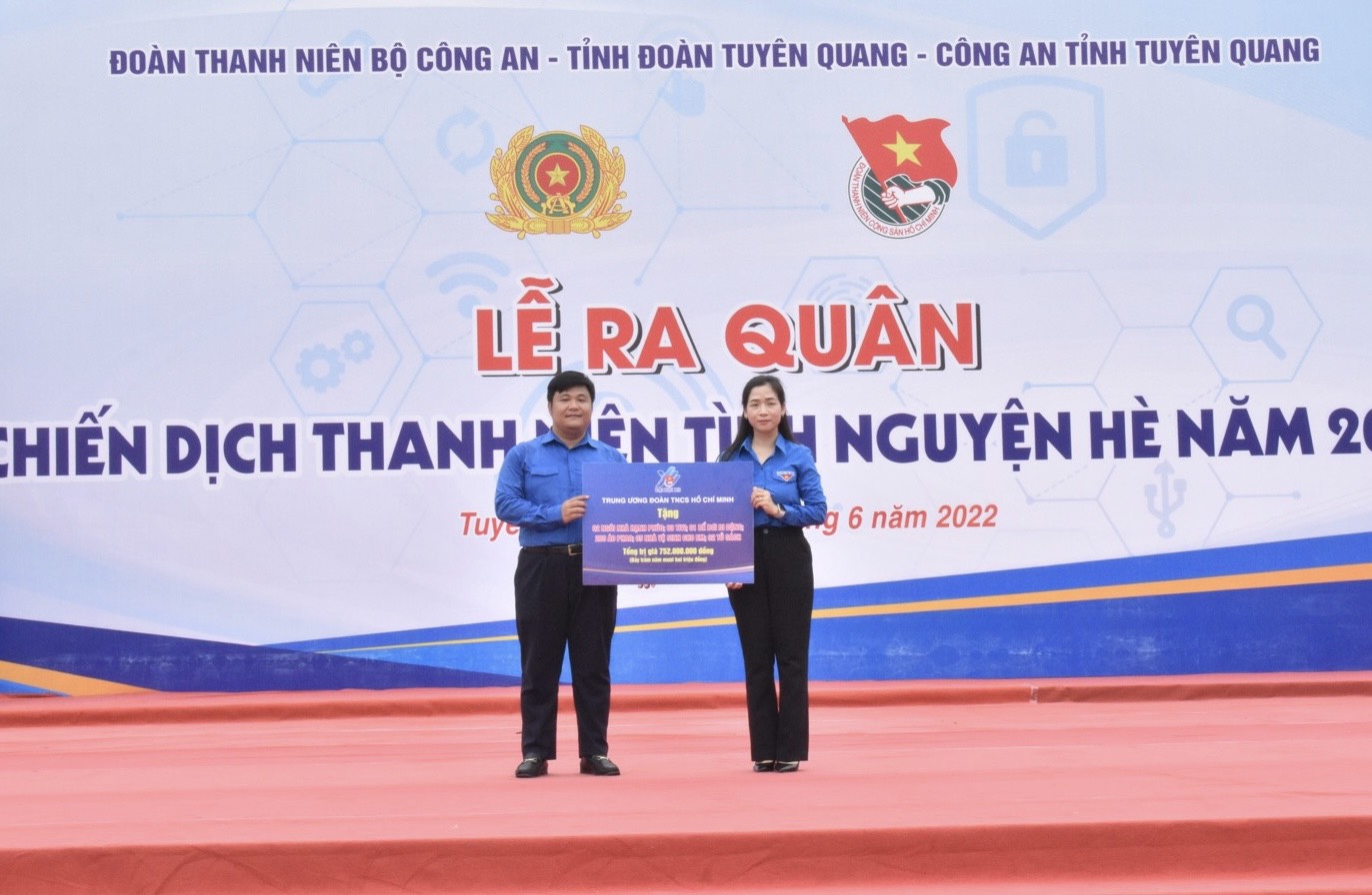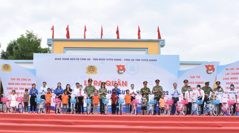 Đoàn thanh niên Bộ Công an trao tặng 20 xe đạp cho học sinh có hoàn cảnh khó khăn trên địa bàn huyện Hàm Yên, đồng thời trao bảng hỗ trợ các hoạt động an sinh xã hội cho Tỉnh đoàn Tuyên Quang gồm: 20 mô hình phát triển kinh tế gắn với đảm bảo an ninh trật tự, 01 công trình “Thắp sáng đường quê”, 02 máy vi tính, 02 máy lọc nước cho Công an xã, 20 téc nước, 02 thư viện sách và 30 bình chữa cháy cầm tay, 02 công trình Nhà vệ sinh cho em, 20 xe đạp, 02 thư viện thiếu nhi, 200 áo phao phòng, chống đuối nước cho trẻ em với tổng trị giá 520 triệu đồng; Kênh Youtube Đông Bắc quê tôi trao tặng biển tượng trưng hỗ trợ xây dựng 8 ngôi nhà 26/3 và 01 ngôi nhà khăn quàng đỏ với tổng kinh phí 670 triệu đồng cho Tỉnh đoàn Tuyên Quang.