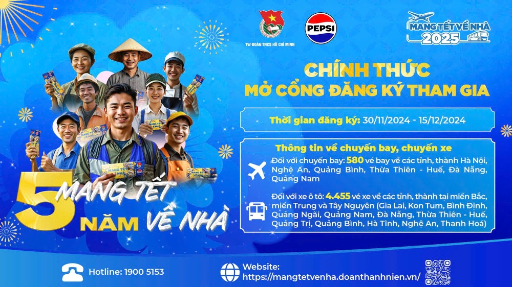 Cổng đăng ký trực tuyến chính thức mở từ 6 giờ sáng ngày 30/11. Người tham gia có thể đăng ký tại website: mangtetvenha.doanthanhnien.vn hoặc theo dõi thông tin chi tiết qua fanpage chính thức: Mang Tết về nhà 2025.