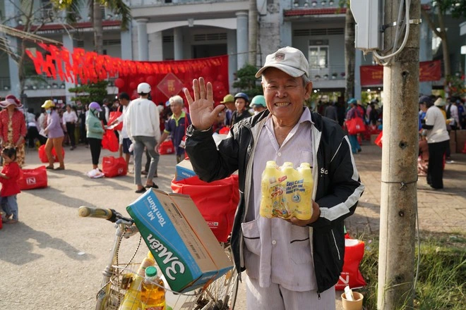 Bà E bảo 70 năm cuộc đời ở vùng xa xôi, chưa bao giờ thấy tết vui đến thế. Sáng sớm ngày cuối tháng chạp, bà cầm phiếu mua hàng tổng trị giá hơn 500.000 đồng bắt xe ôm đến phiên chợ, được tình nguyện viên lấy giúp từng món bà cần.