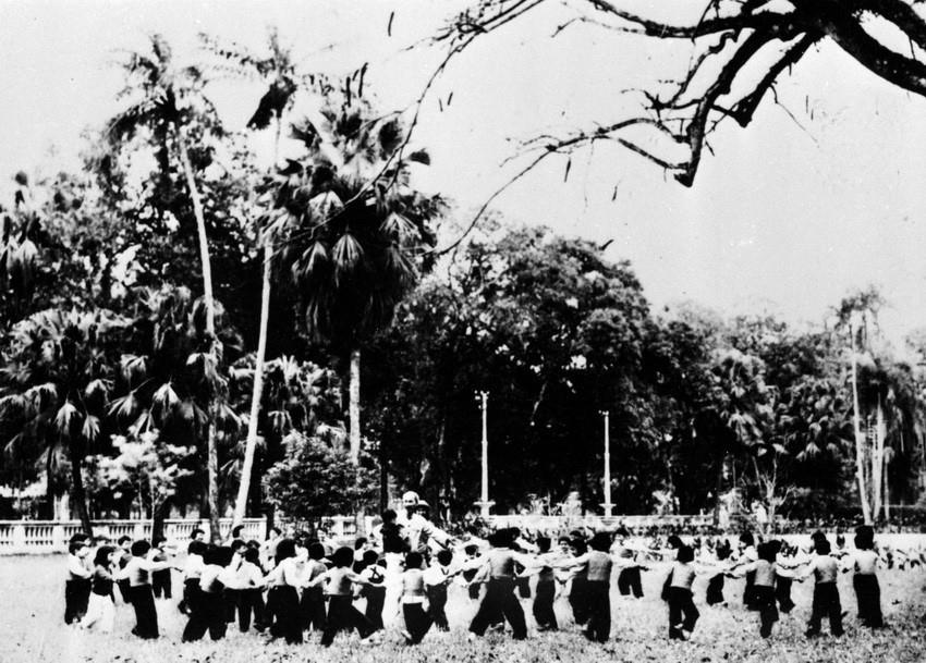 Nhân dịp Tết Nguyên đán đầu tiên sau hòa bình, thiếu nhi Thủ đô Hà Nội đến chúc Tết Bác Hồ và múa hát quanh Bác trong vườn hoa Phủ Chủ tịch (9/2/1955). (Nguồn: TTXVN)