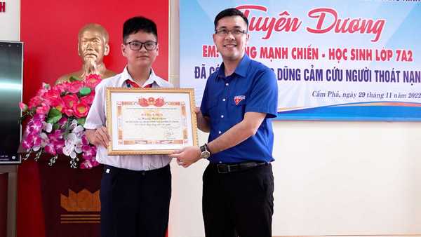 Cùng ngày, UBND Thành phố Cẩm Phả và Tỉnh đoàn Quảng Ninh đã tuyên dương, khen thưởng đột xuất em Hoàng Mạnh Chiến.
