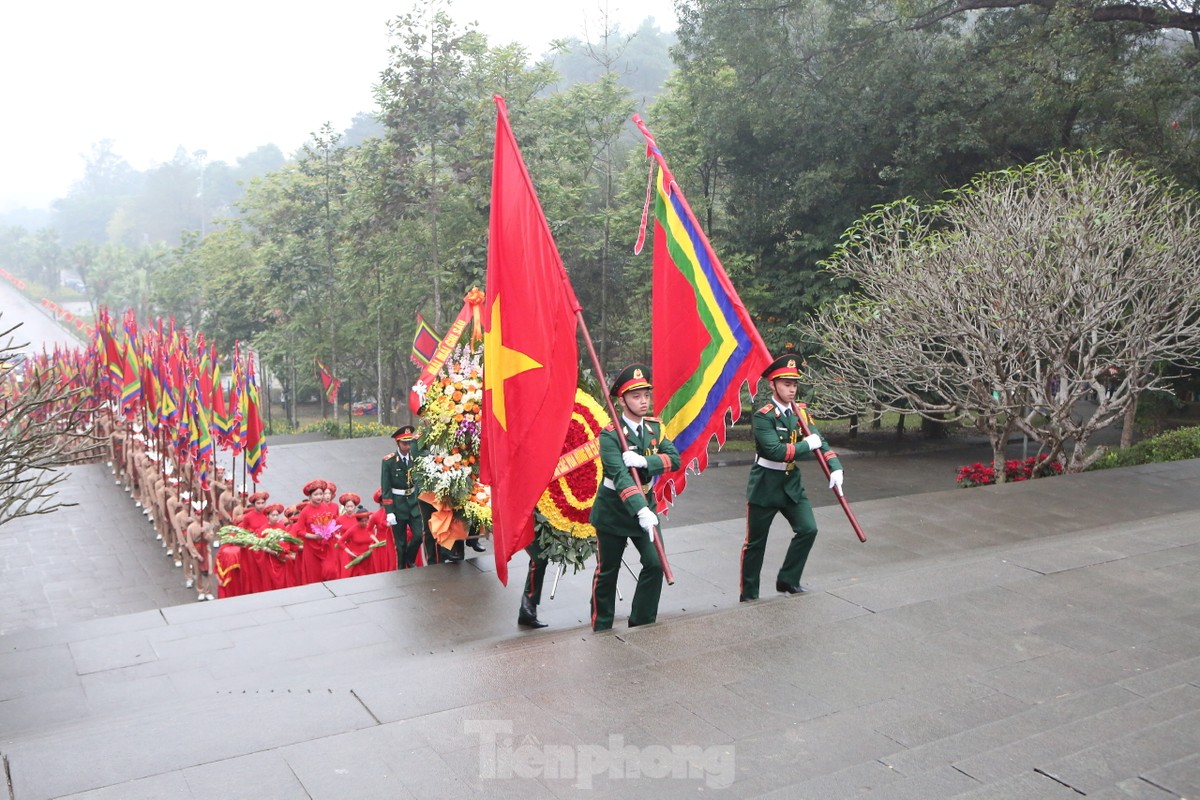 Đi đầu đoàn hành lễ là đội tiêu binh rước Quốc kỳ, cờ hội và vòng hoa mang dòng chữ "Đời đời nhớ ơn các Vua Hùng đã có công dựng nước".