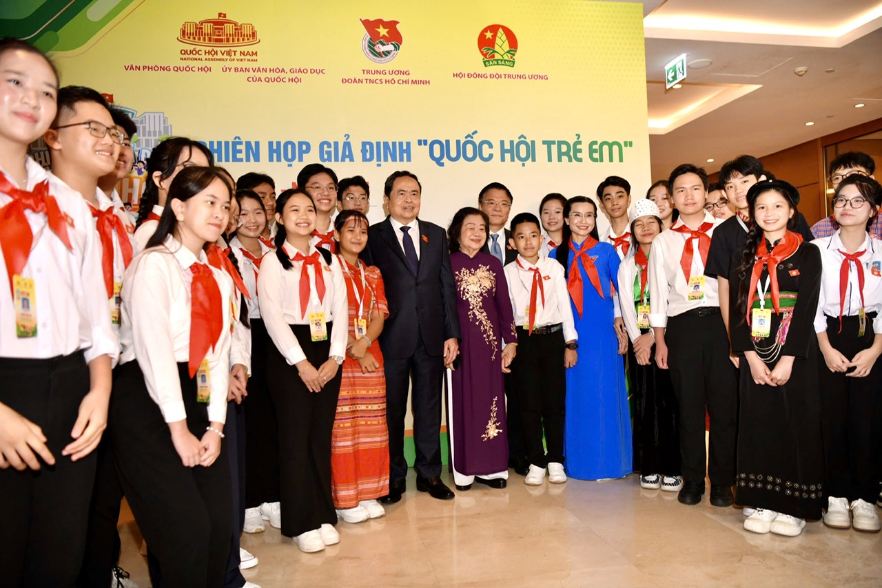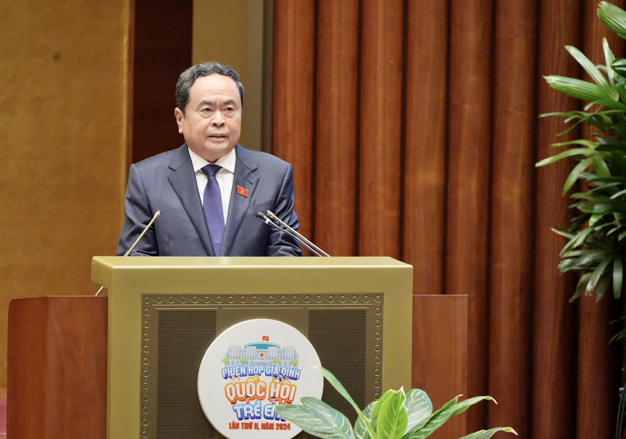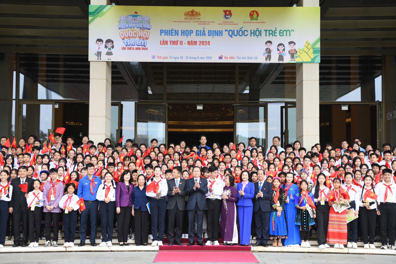 Hôm nay, tại hội trường Diên Hồng, nhà Quốc hội, tôi cùng các đồng chí lãnh đạo, nguyên lãnh đạĐảng, Nhà nước, Mặt trận Tổ quốc Việt Nam rất vui mừng dự Phiên họp giả định “Quốc hội trẻ em” lần thứ 2 - năm 2024. Thay mặt lãnh đạo Đảng, Nhà nước tôi xin gửi tới các đồng chí lãnh đạo, nguyên lãnh đạo Đảng, Nhà nước, Mặt trận Tổ quốc Việt Nam lời chúc mạnh khỏe và xin trân trọng cảm ơn các đồng chí đã dành thời gian tham dự; đặc biệt tôi nhiệt liệt chào mừng và gửi tới 306 đại biểu Quốc hội trẻ em đến từ 63 tỉnh, thành phố trong cả nước tình cảm quý mến và lời chúc mừng nồng nhiệt nhất.