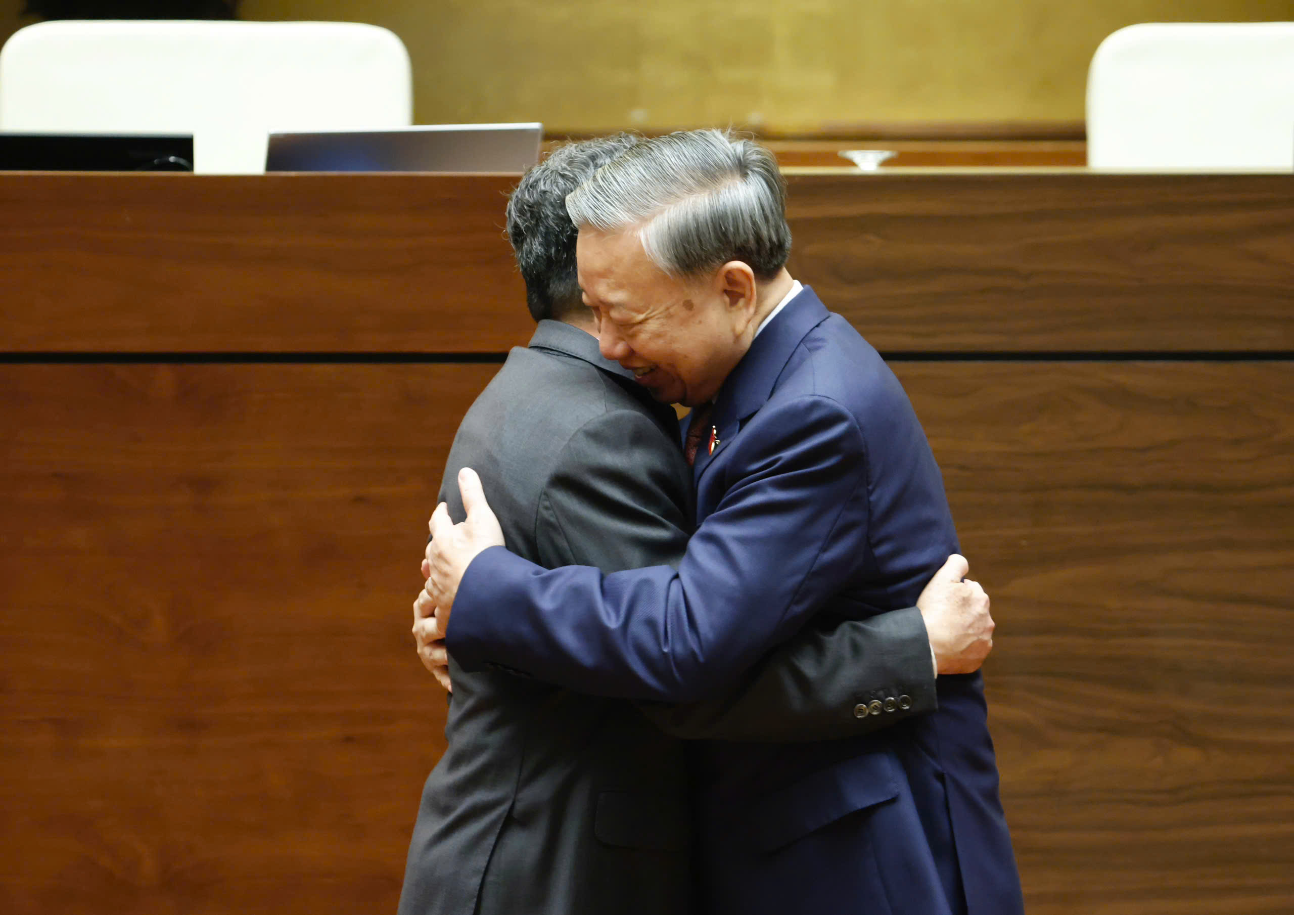 Tổng Bí thư Tô Lâm chúc mừng Chủ tịch Quốc hội Trần Thanh Mẫn. ẢNH: GIA HÂN