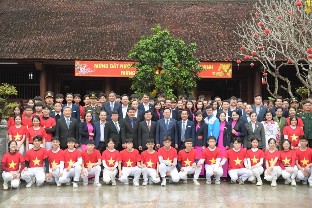 Chủ tịch Quốc hội Vương Đình Huệ cùng Đoàn công tác chụp ảnh lưu niệm cùng đoàn viên, thanh niên
