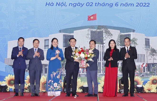 Nhóm Đại biểu Quốc hội trẻ khóa XV tặng hoa Chủ tịch Quốc hội Vương Đình Huệ. (Ảnh: Doãn Tấn/TTXVN)