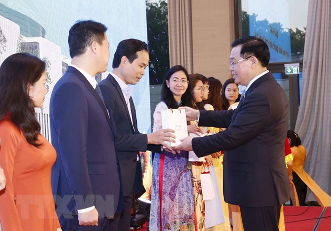 Chủ tịch Quốc hội Vương Đình Huệ tặng hoa Nhóm đại biểu Quốc hội trẻ khóa XV. (Ảnh: Doãn Tấn/TTXVN)