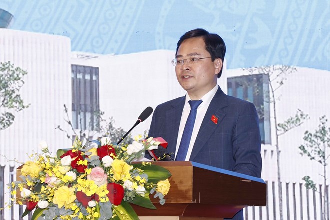 Bí thư thứ nhất Trung ương Đoàn TNCS Hồ Chí Minh Nguyễn Anh Tuấn, Chủ tịch Nhóm Đại biểu Quốc hội trẻ khóa XV phát biểu. (Ảnh: Doãn Tấn/TTXVN)