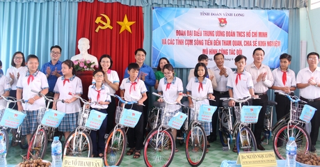 Dịp này, Trung ương Đoàn và Đoàn Thanh niên các tỉnh cụm đồng bằng sông Tiền cũng tặng 10 xe đạp cho học sinh khó khăn, trao tủ sách cho Trường THCS Thanh Đức, trao tặng sân chơi cho thiếu nhi huyện Long Hồ và thăm, tặng quà 3 gia đình chính sách ở xã Thanh Đức.