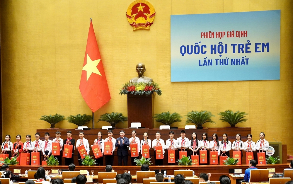 Nhân dịp này, Chủ tịch Quốc hội đã tặng quà cho các thiếu nhi tham gia Phiên họp giả định Quốc hội trẻ em” lần thứ I - năm 2023.
