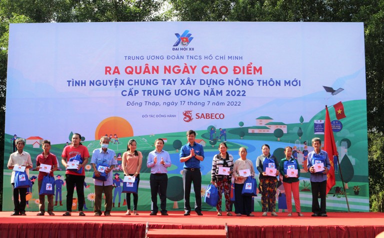 Nhân dịp này, Trung ương Đoàn trao tặng hỗ trợ tỉnh Đồng Tháp 450 triệu xây dựng thôn, bản nông thôn mới để thực hiện 01 Gian hàng nông nghiệp số trên nền tảng Metaverse; 02 bộ dụng cụ tập thể thao ngoài trời; kệ sách và 2.000 quyển sách; 15 điểm QR tại các điểm thăm quan, du lịch; Địa điểm check in tại cụm dân cư; 10 hệ thống camera giám sát các ngõ ra vào; 500 sọt rác cho các hộ dân trên tuyến dân cư; 10 bồn đựng nước cho các gia đình có hoàn cảnh khó khăn, quà tặng 10 gia đình chính sách và 10 em học sinh nghèo vượt khó.