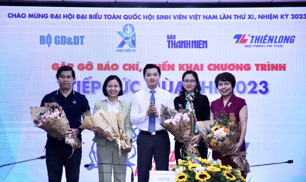 Đồng chí Nguyễn Minh Triết, Bí thư T.Ư Đoàn, Chủ tịch Hội SVVN tặng hoa cho đại diện các chương trình đồng hành tổ chức chương trình Tiếp sức mùa thi năm 2023