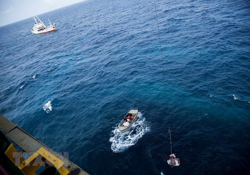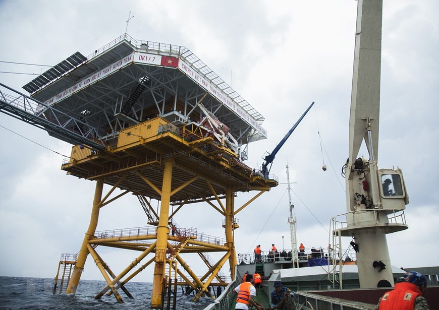 Tàu Trường Sa 10 tiếp cận nhà giàn DK1 để chuyển quà Tết bằng cần cẩu. (Ảnh: Hồng Đạt/TTXVN)