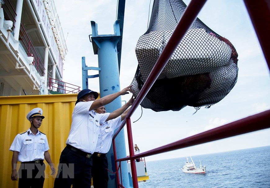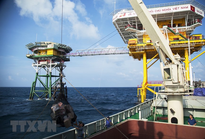 Chuyển quà Tết từ tàu Trường Sa 10 lên nhà giàn DK1. (Ảnh: Hồng Đạt/TTXVN)