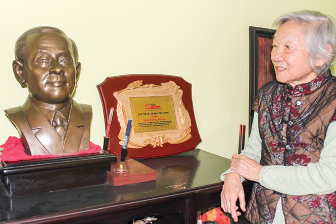 Bà Nguyễn Thị Lan bên cạnh bức phù điêu do báo Tiền Phong kính tặng để tri ân đồng chí Nguyễn Lam, nhân kỷ niệm 60 năm thành lập báo