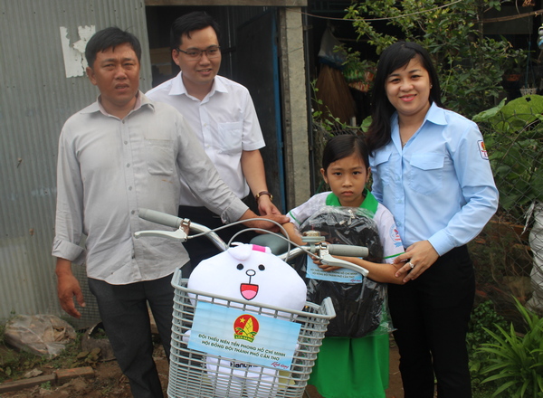 Chị Lư Thị Ngọc Anh – Phó Bí thư Thành đoàn Cần Thơ, Chủ tịch Hội đồng Đội thành phố và Anh Nguyễn Ngọc Hiền - Bí thư Chi đoàn Cơ sở Sở Công thương thành phố Cần Thơ trao xe đạp cho em Trần Thị Kim Trang, học sinh lớp 3, Trường Tiểu học Thạnh Mỹ 1, Huyện Vĩnh Thạnh