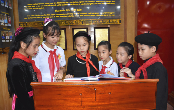 Em Triệu Minh Anh, dân tộc Tày, chi đội 5C, Liên đội trường Tiểu học Vĩnh Lộc (thứ 3 từ trái sang) thăm quanphòng truyền thống tại trường Đại học Tân Trào