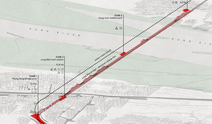 Linh đề xuất 4 điểm xung quanh chưa được sử dụng đúng công năng để kết nối chúng thành tuyến du lịch tàu điện. Điểm bắt đầu tại khu vực đường Lê Văn Linh (ngã ba Phùng Hưng) sẽ là nhà điều hành, quảng trường, sinh hoạt lễ hội. Vườn hoa Ngọc Thụy - cuối cầu Long Biên là ga đón. Nhịp nối giữa hai ga là bãi giữa sông Hồng.