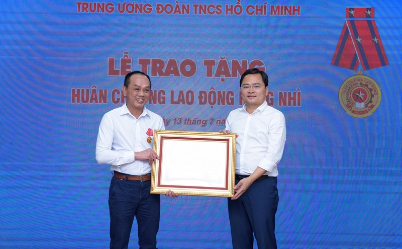 Đồng chí Nguyễn Anh Tuấn - Ủy viên T.Ư Đảng, Bí thư thứ nhất T.Ư Đoàn trao Huân chương Lao động hạng Nhì của Chủ tịch nước cho đồng chí Trần Nguyên Hưng - Nguyên Phó trưởng Ban biên tập Ban Phát thanh Thanh thiếu nhi