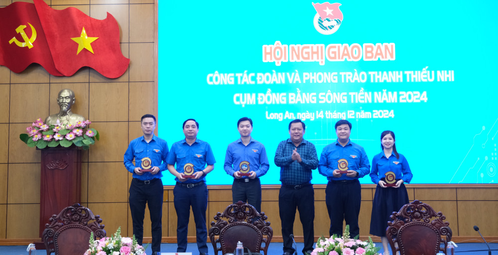 Đại diện lãnh đạo tỉnh trao tặng biểu trưng cho các Tỉnh đoàn trong Cụm đồng bằng sông Tiền