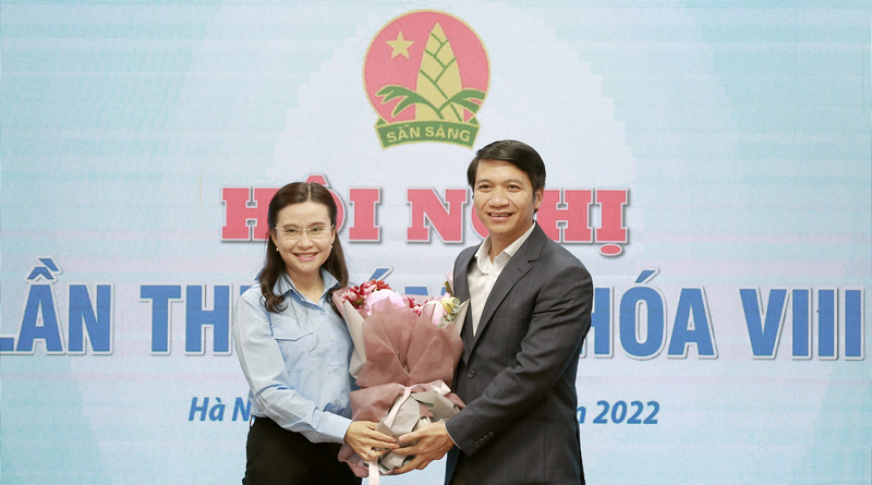 Tân Chủ tịch Hội đồng Đội Trung ương Nguyễn Phạm Duy Trang tặng hoa cảm ơn và tri ân đồng chí Nguyễn Ngọc Lương - Bí thư Trung ương Đoàn, Chủ tịch T.Ư Hội LHTN Việt Nam, nguyên Chủ tịch Hội đồng Đội Trung ương khóa VIII
