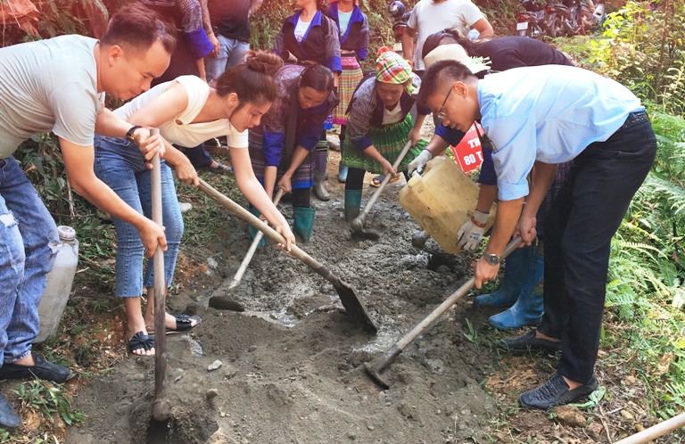 Sau lễ khởi công, đoàn viên thanh niên và người dân cũng như đoàn thiện nguyện đã bắt tay ngay vào làm tuyến đường của bản Nả Háng. Tôi hỏi chị Lại Phương Lan – Giám đốc Trung tâm thẩm mỹ Lại Lan Trang, người rất có tâm trong các chương trình tình nguyện cũng là người kết nối các tấm lòng hảo tâm để ủng hộ 80 tấn xi măng để làm con đường này: “Chị thấy chuyến đi thế nào?”. Vừa cùng người dân san gạt bê tông trên mặt đường chị trả lời: “Đây là chuyến đi ý nghĩa của cá nhân chị cũng như của cả đoàn, đúng là làm ra một con đường bê tông ở nơi đây, máy móc không vào được, toàn bộ phải làm bằng sức người thế này quả thật quá khó khăn, và đúng là: chẳng thể  đong đếm được con đường này trị giá bao nhiêu tiền... rất may đoàn đã vận động kịp để phối hợp với Hội Đồng đội – Tỉnh đoàn Yên Bái làm con đường này cho các em đi học, người dân giao thương đỡ vất vả, cũng rất vinh dự cho đoàn khi biết công trình này nằm trong cụm công trình “Con đường em đến trường” để chào mừng Đại hội Đảng bộ tỉnh Yên Bái lần thứ XIX.”