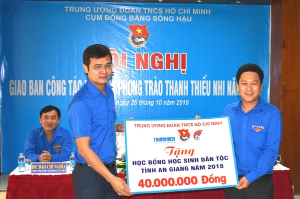 Đồng chí Bùi Quang Huy, Bí thư Trung ương Đoàn trao bảng tượng trưng kinh phí học bổng cho học sinh dân tộc tỉnh An Giang, tại Hội nghị giao ban