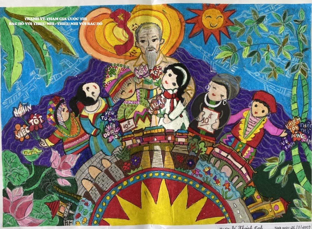 Theo đó, ở nội dung thi vẽ tranh, giải Nhất bảng Tiểu học là tác phẩm "Chúng cháu về thăm Bác" của em Đỗ Khánh Linh, lớp 5D, Trường Tiểu học Lê Văn Tám, TP Thanh Hóa, tỉnh Thanh Hóa; giải Nhất bảng THCS thuộc về tác phẩm "Hành trình theo dấu chân Bác" của em Nguyễn Châu Phương Trinh, lớp 7A2 Trường THCS thị trấn Giồng Trôm, huyện Giồng Trôm, tỉnh Bến Tre.