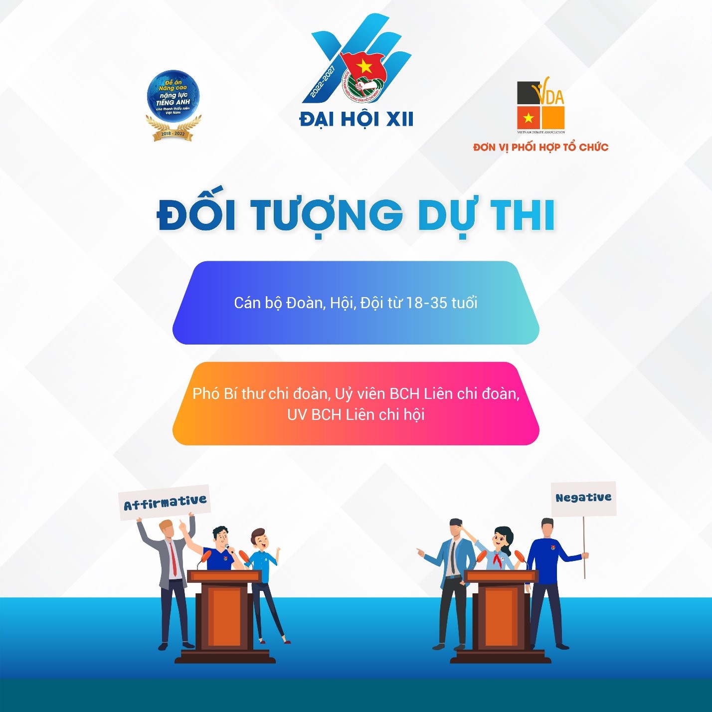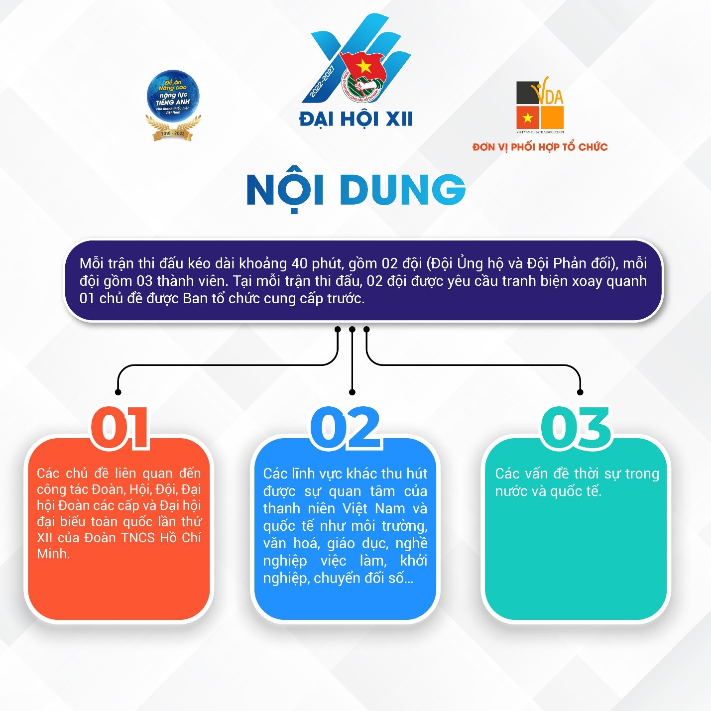 Cụ thể hóa chương trình hành động thực hiện Nghị quyết Đại hội đại biểu toàn quốc Đoàn TNCS Hồ Chí Minh lần thứ XI, nhiệm kỳ 2017 – 2022 và triển khai Đề án nâng cao năng lực tiếng Anh cho thanh thiếu niên Việt Nam giai đoạn 2018 – 2022; nhằm hướng dẫn, cung cấp các kiến thức, kỹ năng cơ bản và nâng cao về lĩnh vực tranh biện; tạo sân chơi lành mạnh, môi trường rèn luyện tiếng Anh cho đội ngũ cán bộ làm công tác Đoàn, Hội chuyên trách hoặc kiêm nhiệm trên phạm vi toàn quốc, Trung ương Đoàn tổ chức Cuộc thi Tranh biện tiếng Anh cho cán bộ Đoàn, Hội, Đội toàn quốc năm 2022.
