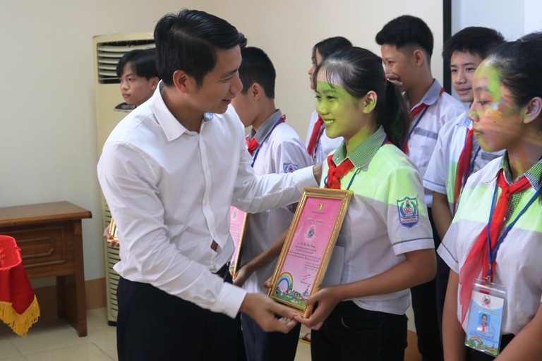 Đồng chí Nguyễn Phạm Duy Trang, UVBTV, Trưởng Ban Công tác Thiếu nhi Trung ương Đoàn, Phó Chủ tịch Thường trực Hội Đồng đội Trung ương trao giấy chứng nhận cho các em học sinh
