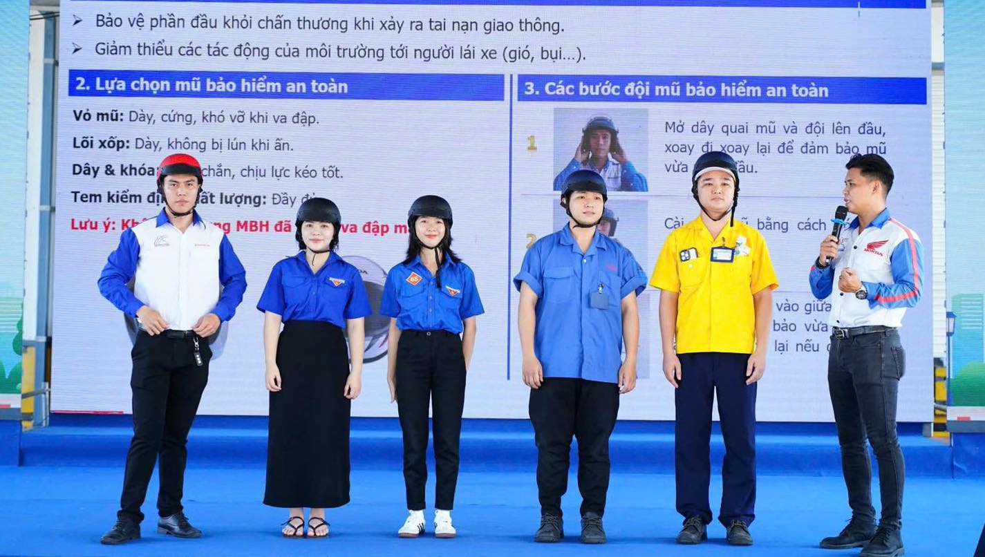 Các đoàn viên thanh niên được hướng dẫn về cách lựa chọn mũ bảo hiểm an toàn