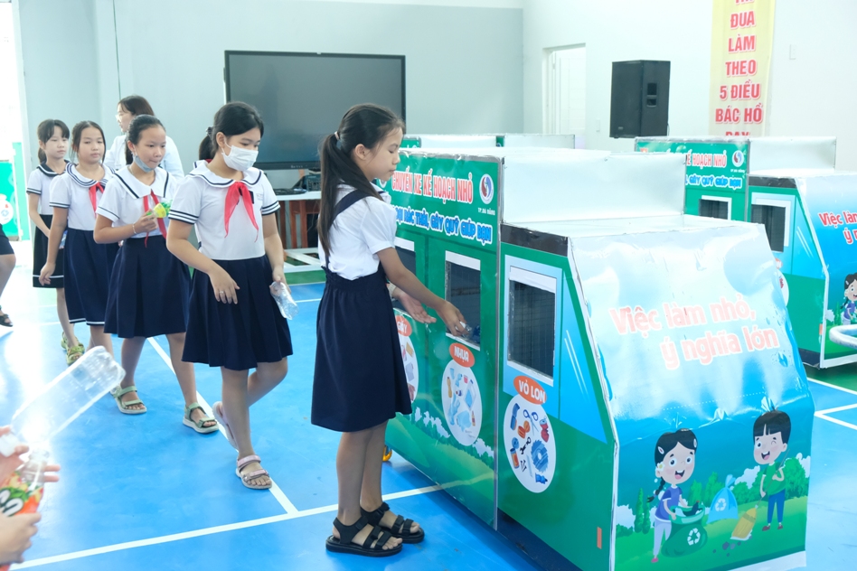 Đại diện các em học sinh trường Tiểu học Trần Nhân Tông quận Cẩm Lệ hưởng ứng thực hiện mô hình “Chuyến xe kế hoạch nhỏ - Phân loại rác thải gây quỹ giúp bạn”.