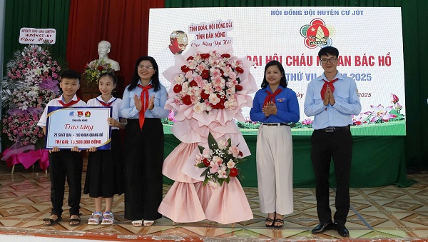 Dịp này, Tỉnh đoàn - Hội đồng Đội tỉnh Đắk Nông tặng hoa chúc mừng và trao tặng Đại hội 25 suất quà, 200 khăn quàng đỏ tổng trị giá 13,5 triệu đồng.